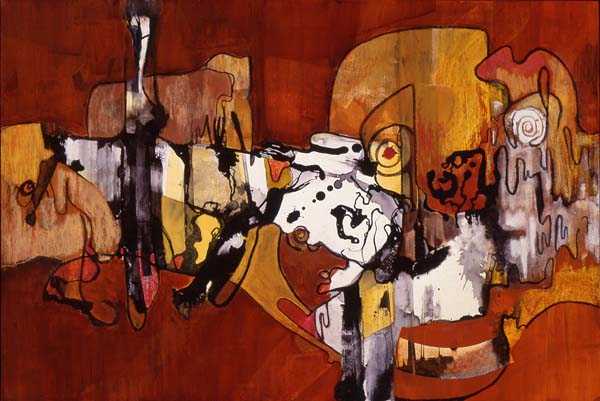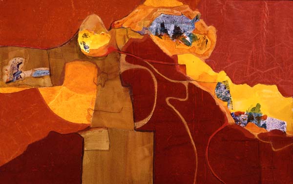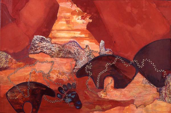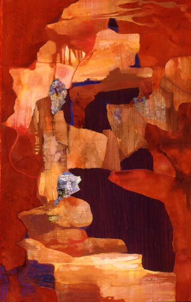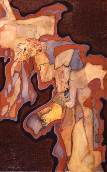 Stone Age, my first conscious series, emerged after a period of experimentation with acrylics. I tore up watercolor paintings and used the pieces to create large shapes. Once the shapes were in place I worked with acrylics. The pallet was chosen to reflect my intense grief over the death of my daughter.